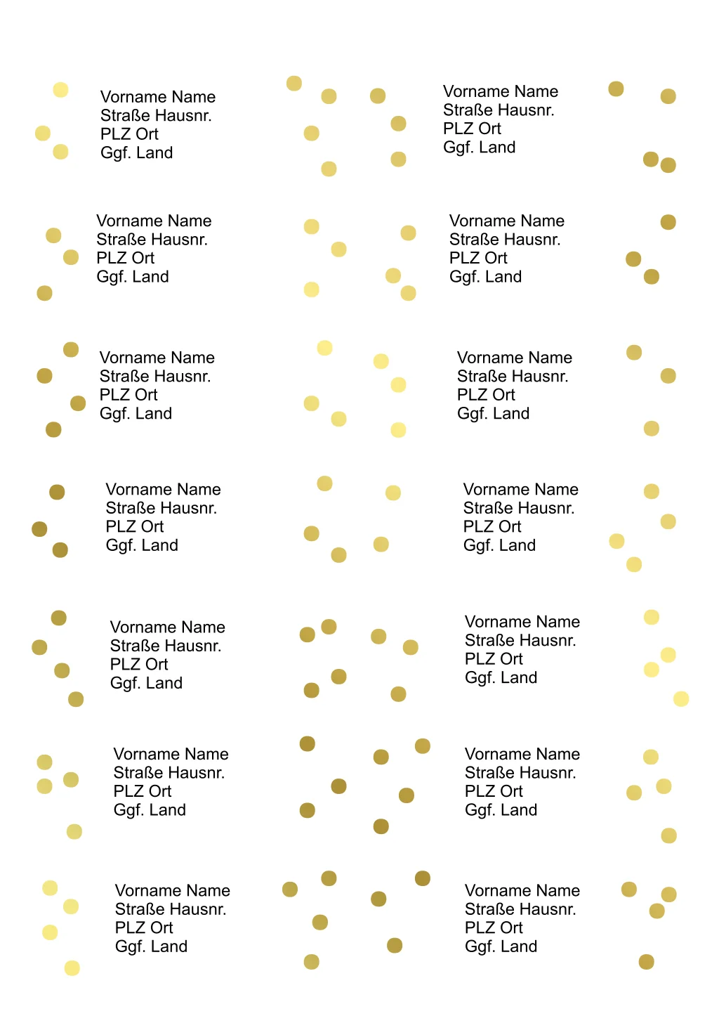Bei dunkelfarbige Umschläge raten wir zu Adressaufklebern, wenn diese zum regulären Briefporto versendet werden sollen. Jeder Bogen beinhaltet 14 Adressaufkleber auf weißem Papier. Die Aufkleber sind mit Punkten aus Goldfolie verziert. Ihr könnt die Adresse beschreiben oder auch bedrucken. Maße der Aufkleber: 97 mm x 34 mm. Ihr könnt zwischen 1-4 Bögen vorauswählen.