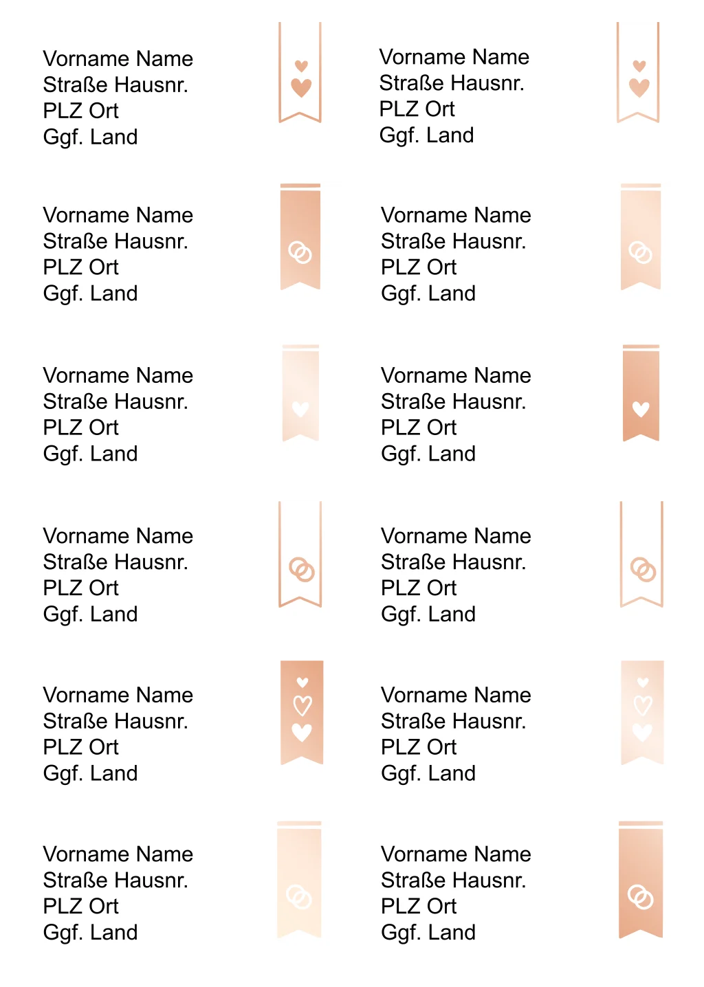 Die Adressaufkleber mit Fähnchen aus glänzender Folie in roségold sind die perfekte Ergänzung für Eure Hochzeitseinladungen oder Jubiläumskarten. Mit den Adressaufklebern verleiht Ihr Euren Briefen einen Hauch von Eleganz und Raffinesse. Auf einem Bogen befinden sich 12 Aufkleber, die Ihr direkt mit der Anschrift Eurer Gäste drucken lassen könnt. Die Aufkleber haben die Maße 97 x 45 mm. Ihr könnt zwischen 1- 6 Bögen auswählen.