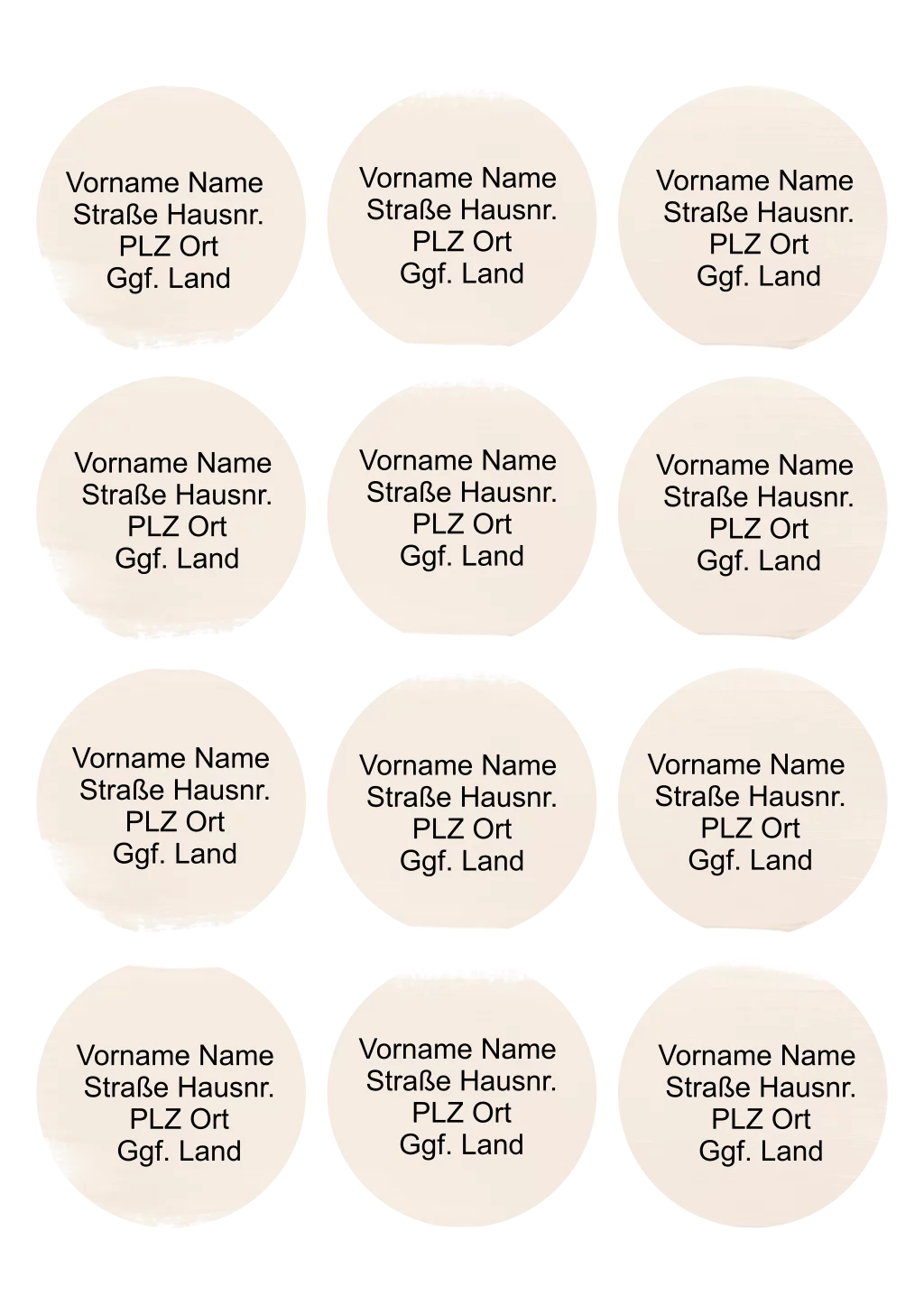 Unsere runden Adressaufkleber mit Pinselstrichen sind perfekt, um eure Einladungen zu personalisieren. Mit 12 Aufklebern je Blatt könnt Ihr Eure Adressen individuell gestalten und anpassen. Die Maße von 63 mm in der Diagonale machen sie zu einer idealen Größe für verschiedene Anwendungen.