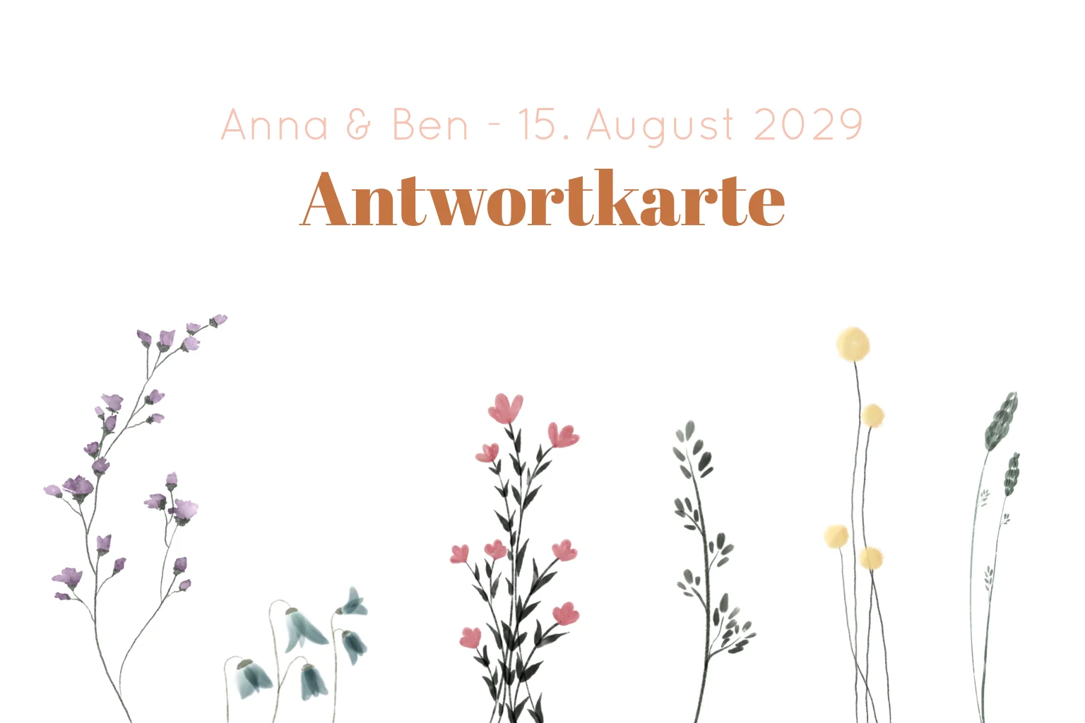 Veredelte Antwortkarte zur Hochzeit mit Blumenwiese und kupferfarbener Schrift