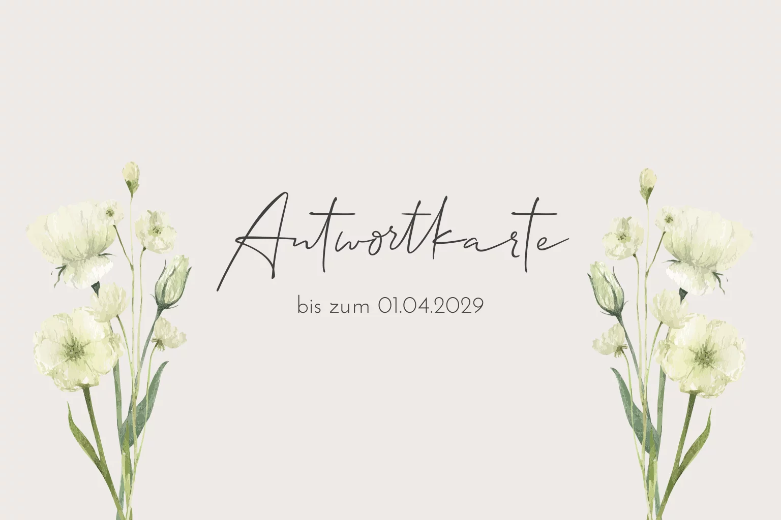 Schlichte Antwortkarte zur Hochzeit in beige mit weißen Blumen