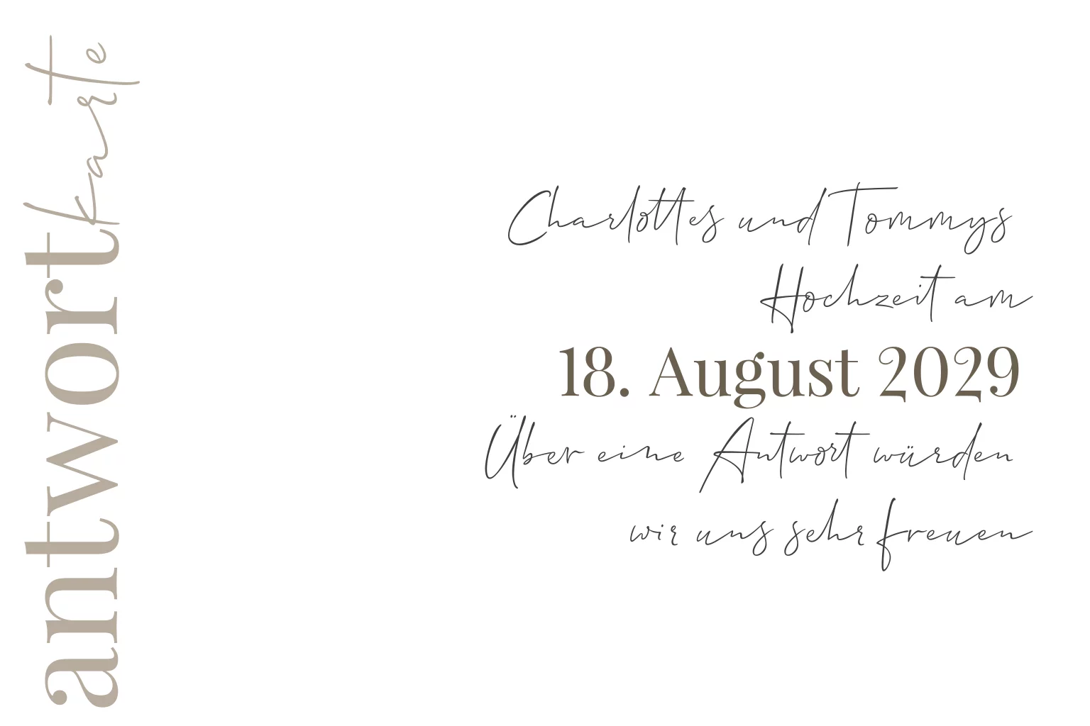 RSVP - Helle Antwortkarte zur Hochzeitseinladung im Postkartenformat mit Schriftzug in beige. Die Rückseite der Karte ist so gestaltet, dass sie direkt an das Hochzeitspaar zurückgesendet werden kann.