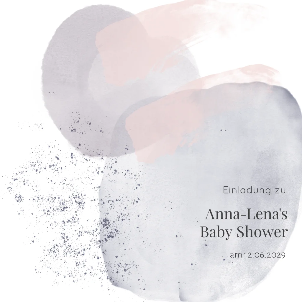 Quadratische Einladung zum Baby Shower mit abstraktem Aquarellhintergrund in Lila und Rosa. Die weiße Klappkarte ist in einem modernen Design gestaltet.