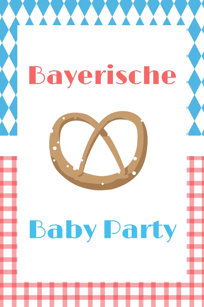 Bayrische Baby Shower Einladung mit Mustern in blau-weiß und rot-weiß plus Brezeln.