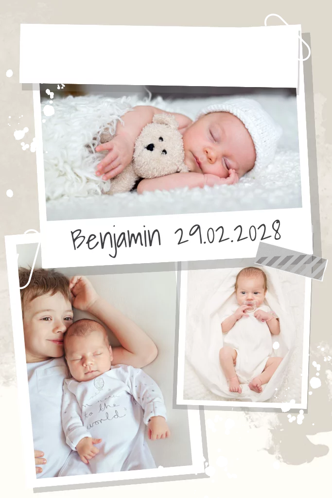 Die Danksagungskarte zur Geburt hat Sofortbild-Fotorahmen, die von Tape und Büroklammern gehalten werden. (Diese Elemente sind gezeichnet und liegen nicht der Kartenbestellung bei.) Ihr könnt in die Postkarte Eure ersten Babyfotos einfügen und auf der Rückseite ein herzliche Dankeschön hinterlassen. 4 Fotos