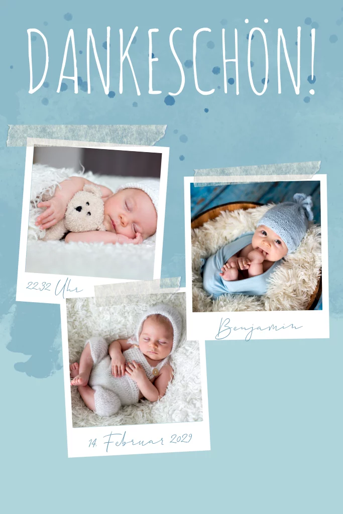 Babydankeskarte mit Sofortbilderrahmen für drei Babyfotos in Blau