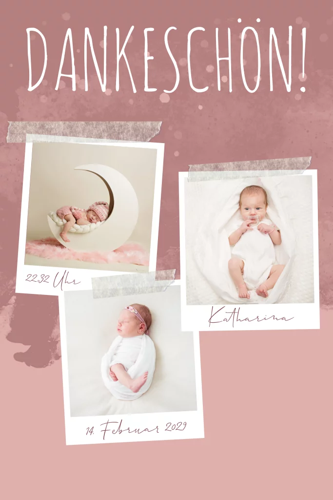 Babydankeskarte mit Sofortbilderrahmen für drei Babyfotos in Rosa