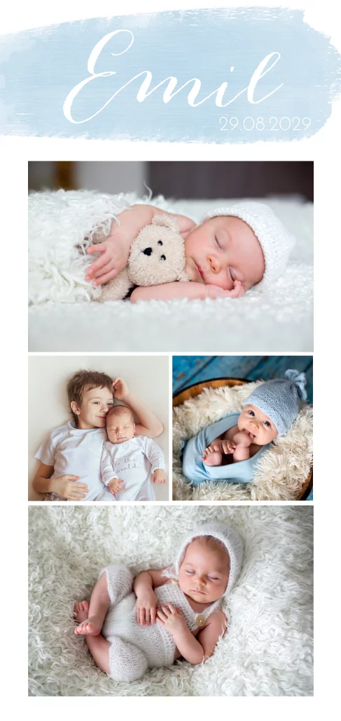 Feiert die Ankunft Eures kleinen Jungen mit unserer einzigartigen Danksagungskarte im Collage-Stil. Die Karte ist mit blauen Akzenten gestaltet und bietet Platz für die ersten Babyfotos, um Euren Dank auf ganz besondere Weise auszudrücken.