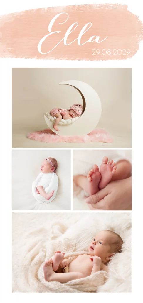 Unsere entzückende Danksagungskarte für Mädchen mit bezaubernden rosa Akzenten im Collage-Stil ist die perfekte Möglichkeit, Euren Dank mit einem Hauch von Niedlichkeit und Persönlichkeit auszudrücken. Die Karte präsentiert die ersten Babyfotos auf eine ganz besondere Art und Weise, die sicherlich das Herz berührt.