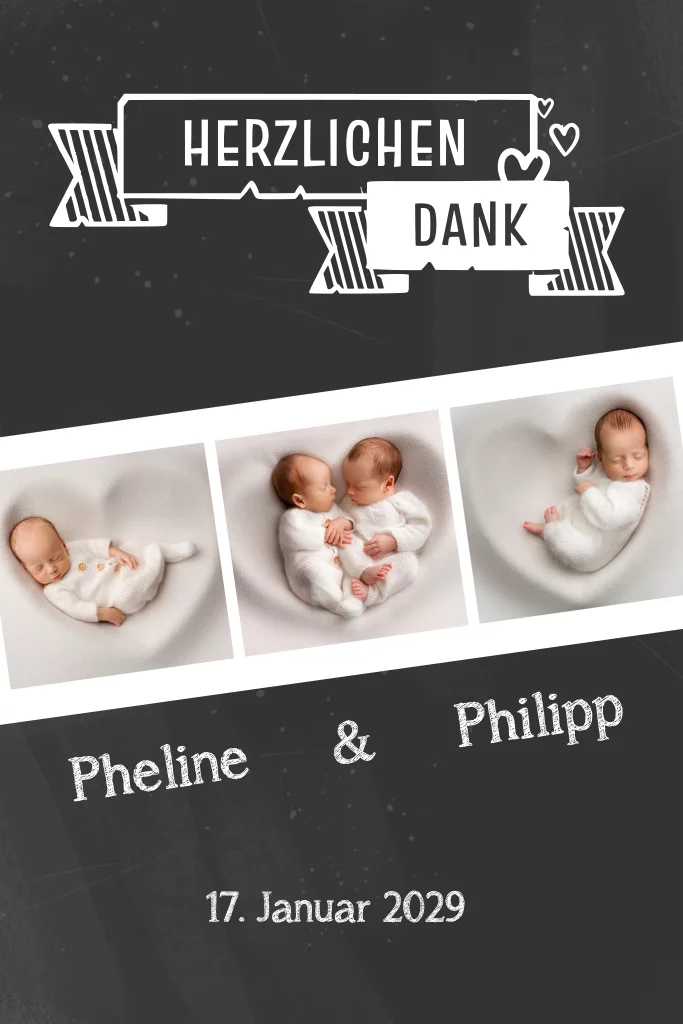 Dankeskarte zur Geburt im Schiefertafel Look mit Fotostreifen