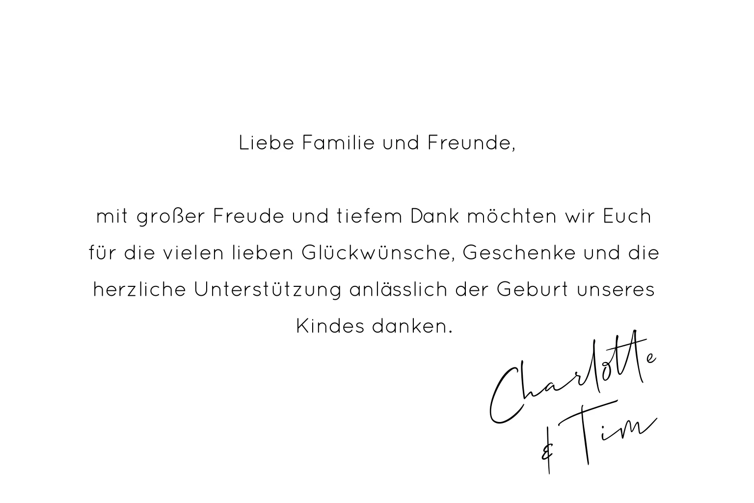 Unsere schlichte Dankeskarte zur Geburt ist die perfekte Möglichkeit, Eure Dankbarkeit mit Stil auszudrücken. Die Klappkarte in strahlendem Weiß ist eine wunderschöne Leinwand für Euer erstes Babybild. Innen ist noch mehr Platz für Bilder vorgesehen. Diese Dankeskarte mit zartem Schriftzug ist klassisch und zeitlos, perfekt für Eltern, die Wert auf schlichte Eleganz legen.