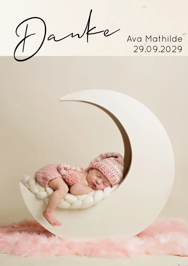 Schlichte Danksagung zur Geburt aus Recyclingpapier mit Foto.