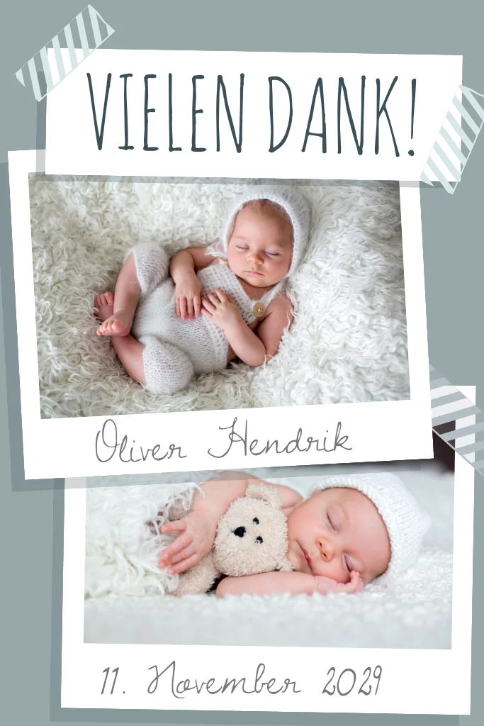 Graublaue Dankeskarte zur Geburt mit Sofortbilder Rahmen und Tape