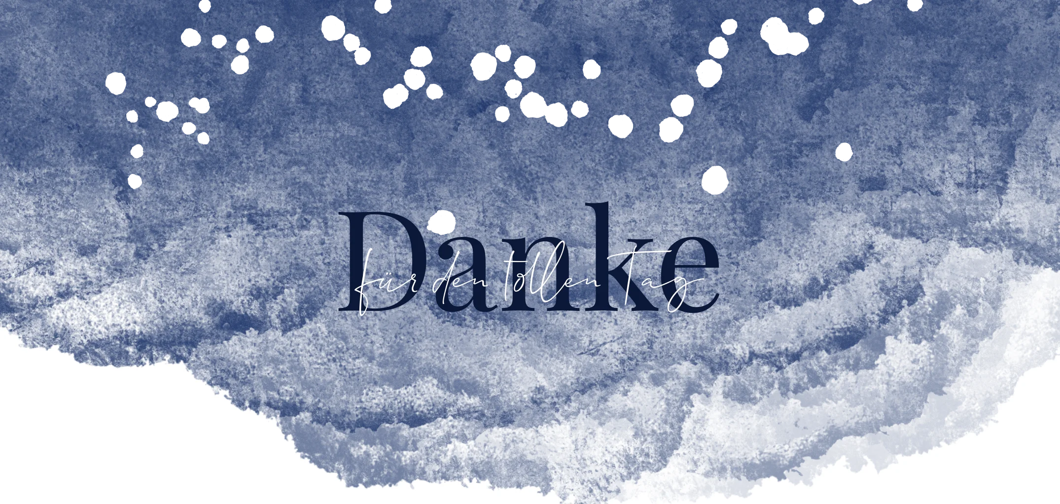 Der dunkelblaue Aquarell-Tintenklecks auf der modernen Dankeskarte wirkt wie ein Samtvorhang. Der starke Ausdruck der Karte erhält durch den Silberregen der Sprenkel einen zarten Hauch.