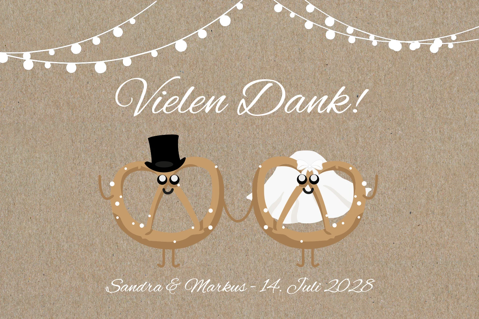 Bayrische Danksagungskarte zur Hochzeit aus Kraftpapier. Die Karte mit niedlichem Brautpaar in Form von Brezeln ist eine lustige Art sich bei den Hochzeitsgästen zu bedanken.
