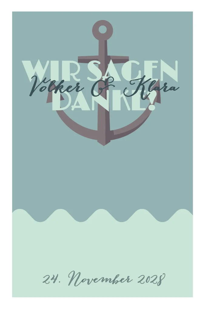 Dankeskarte mit maritimen Elementen: Anker und Welle, in den Farben blau und grün.