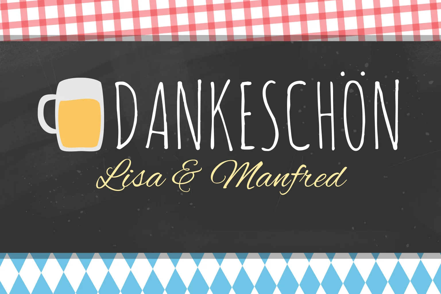 Klappkarte als Danksagungskarte zur Hochzeit im bayrischen Stil mit Schiefertafel, Karomuster in blau, rot und weiß. Zudem ziert die Karte einen Bierkrug und eine Brezel und bietet genügend Platz für Eure Hochzeitsfotos.