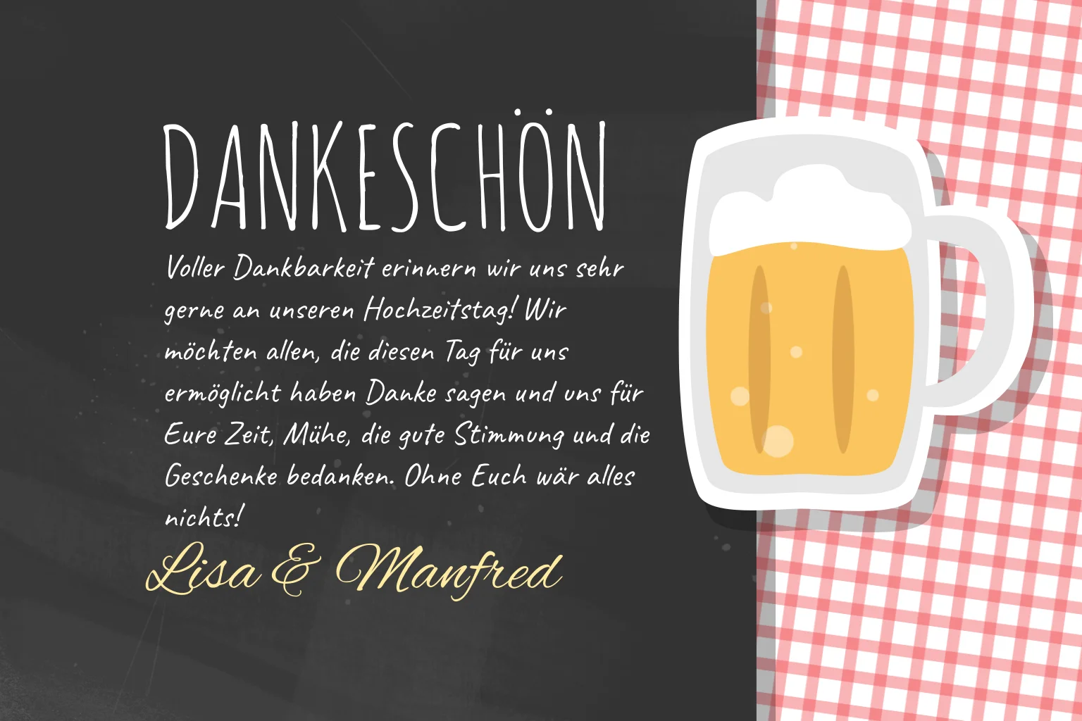Bayrische Dankeskarte zur Hochzeit mit Schiefertafel und Bierkrug