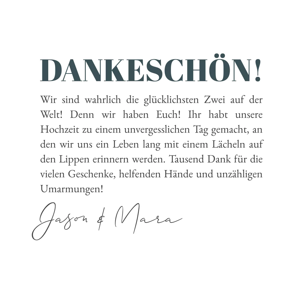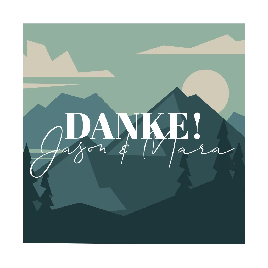 Die quadratische Klappkarte mit Bergpanorama in Blautönen ist eine schöne Idee um Danke zur Hochzeit zu sagen. Sie bietet ausreichend Platz für Eure Hochzeitsfotos und den Danksagungstext.