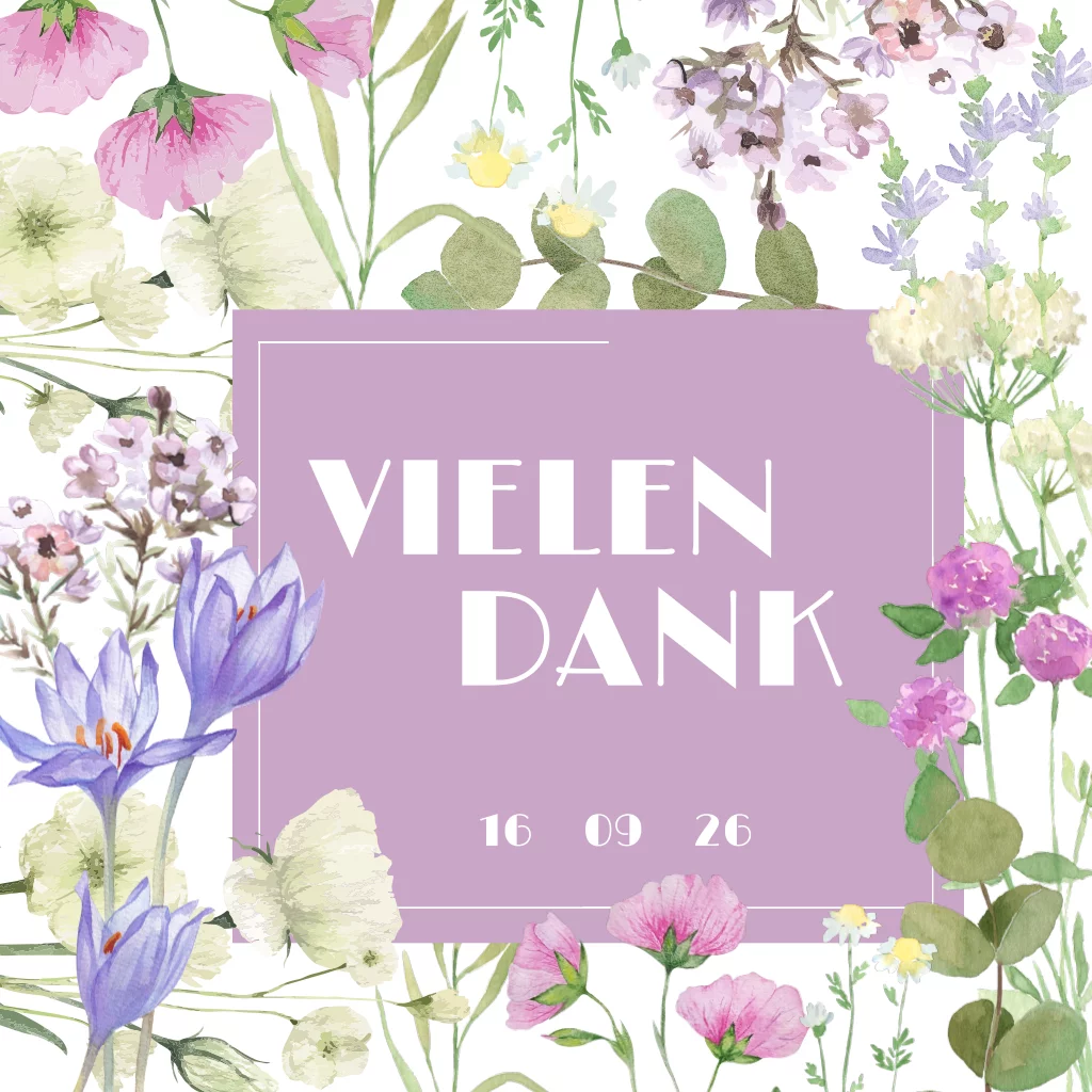 Frühlings Dankeskarte zur Hochzeit mit bunten Blumen + Rahmen in lila