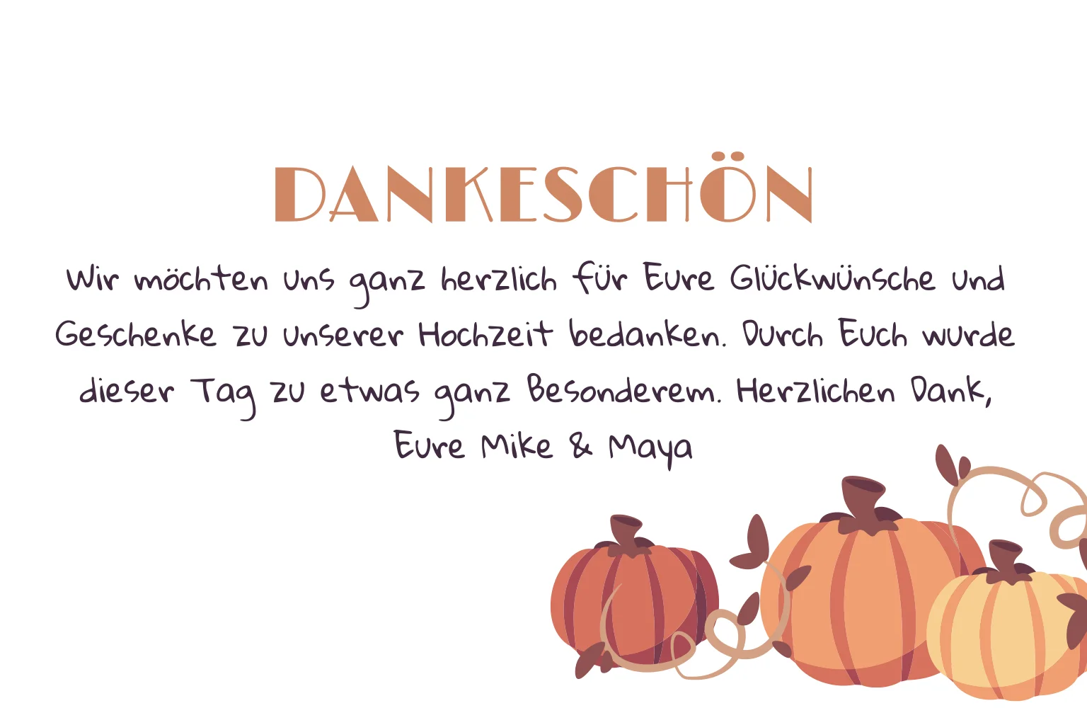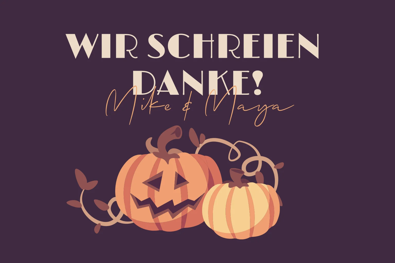 Lila Halloween Danksagungskarte zur Hochzeit mit Kürbissen. Die Klappkarte bietet ausreichend Platz für Eure ersten Hochzeitsfotos und den Dankestext.