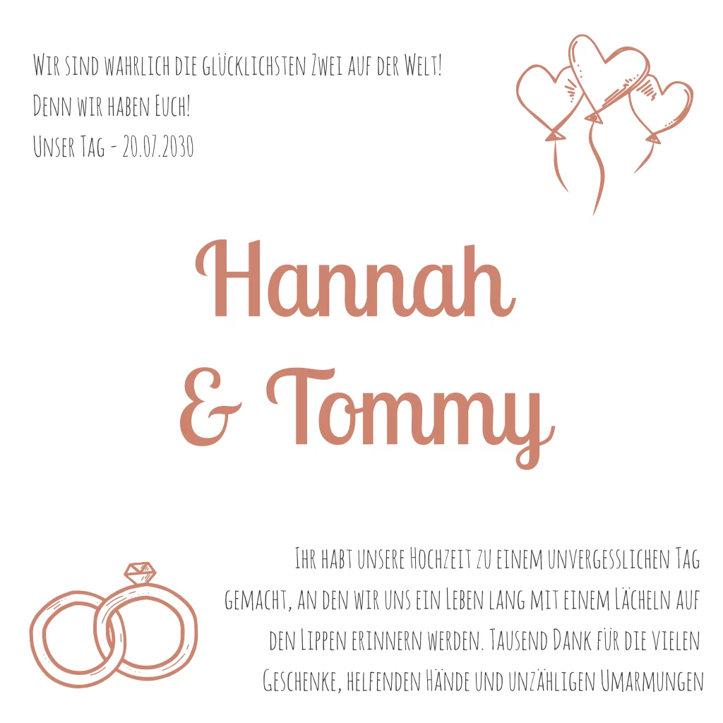 Die quadratische Dankeskarte zur Hochzeit ist vorne weiß und auf der Rückseite in Terrakotta. Namen, sowie Ringe und Luftballon Icons sind ebenfalls in Terrakotta gehalten.