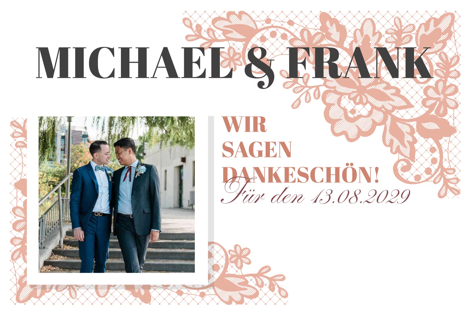 Weiße Postkarte als Dankeschön zur Hochzeit mit roter Spitze und Foto.
