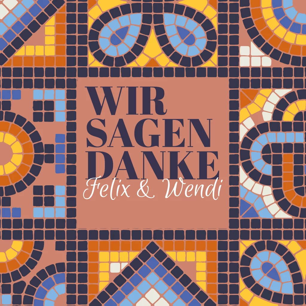 Quadratische Klappkarte als Dankeskarte für die Hochzeit mit buntem Mosaikmuster.