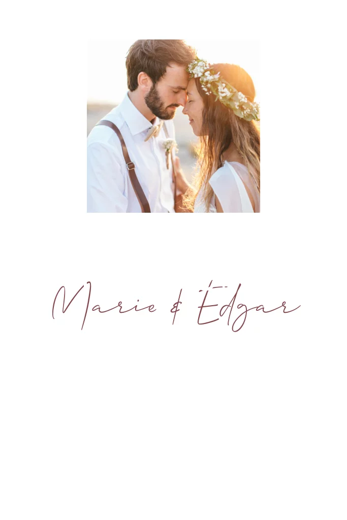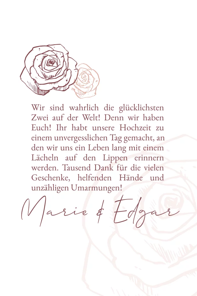 Weiße Danksagungskarte zur Hochzeit als Klappkarte mit Rose und Fotorahmen holografisch foliert. Auf der Innenseite finden weitere Fotos Platz. Die Schrift ist Weinrot gehalten, kann aber von Euch verändert werden.
