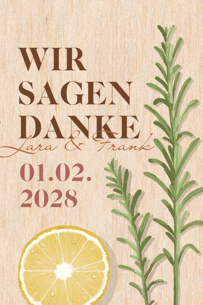 Danksagungskarte aus Holz mit Rosmarin und Zitrone