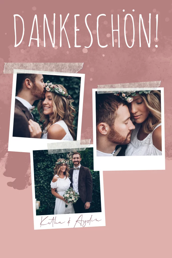 Danksagungskarte mit Sofortbildern, Klebestreifen und Stempel in Rosatönen.