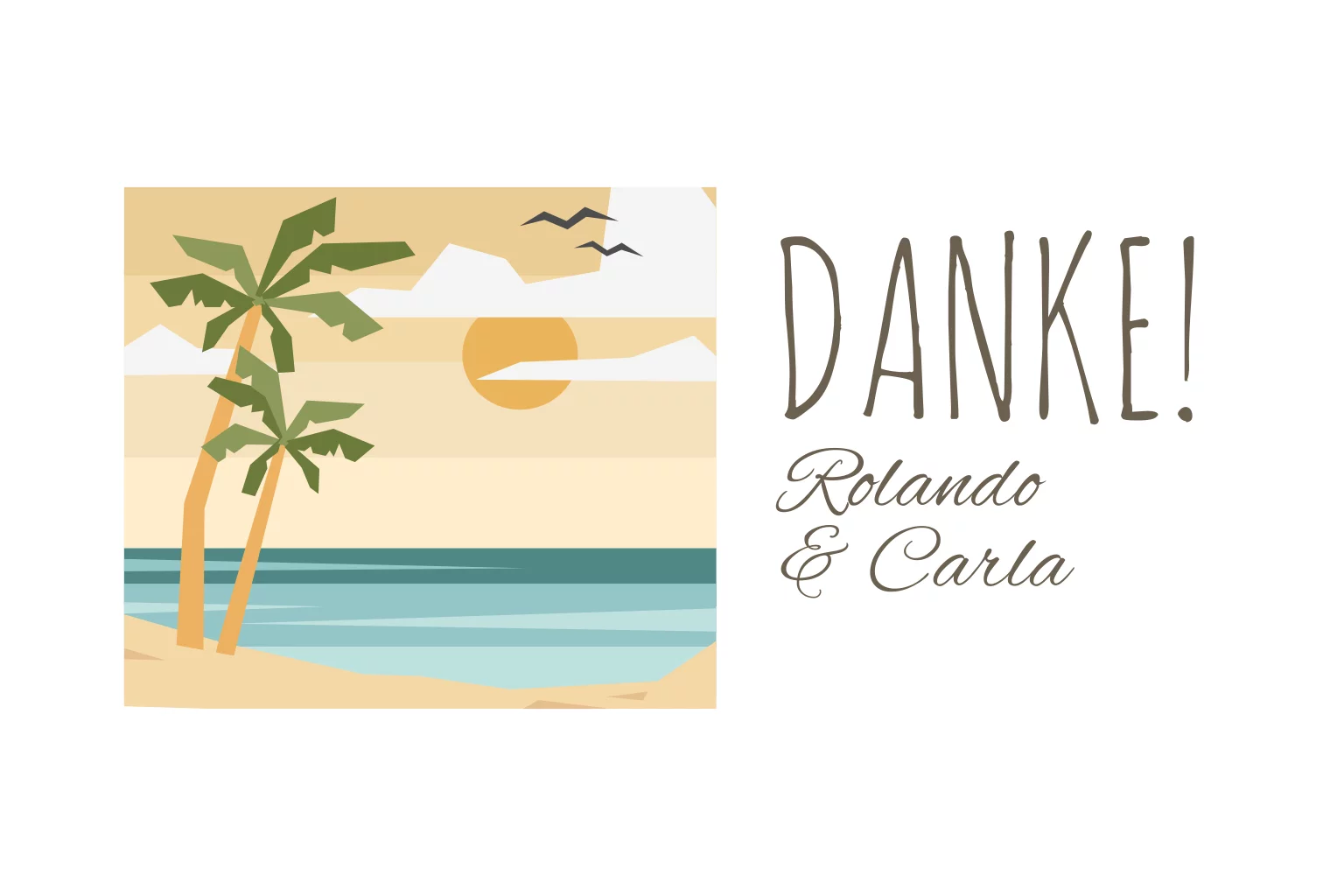 Weiße Dankeskarte zur Hochzeit als Klapppostkarte mit Sommer-Strandmotiv im Comic Stil.