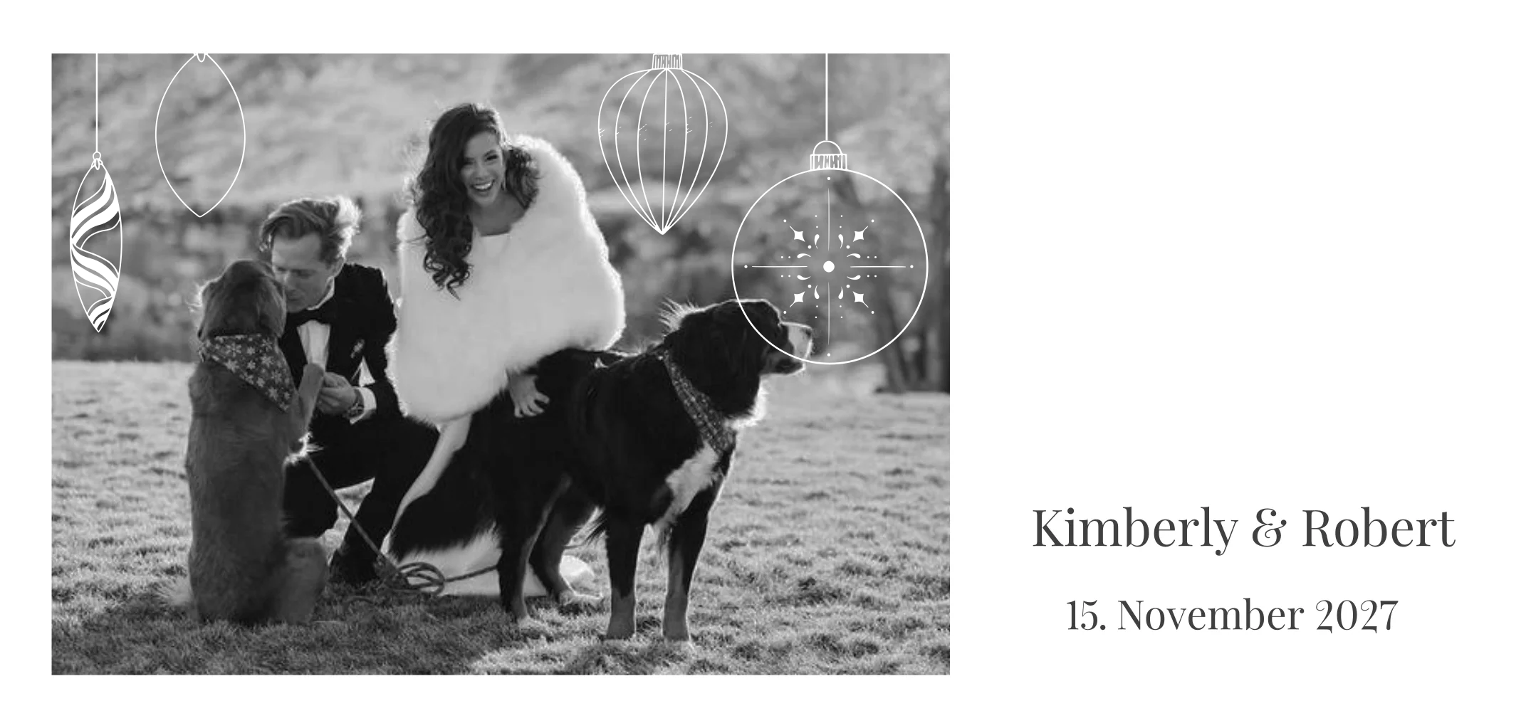 Schlichte veredelte Danksagungskarte zur Hochzeit mit Foto und goldenen Weihnachtskugeln im Line-Art Stil.