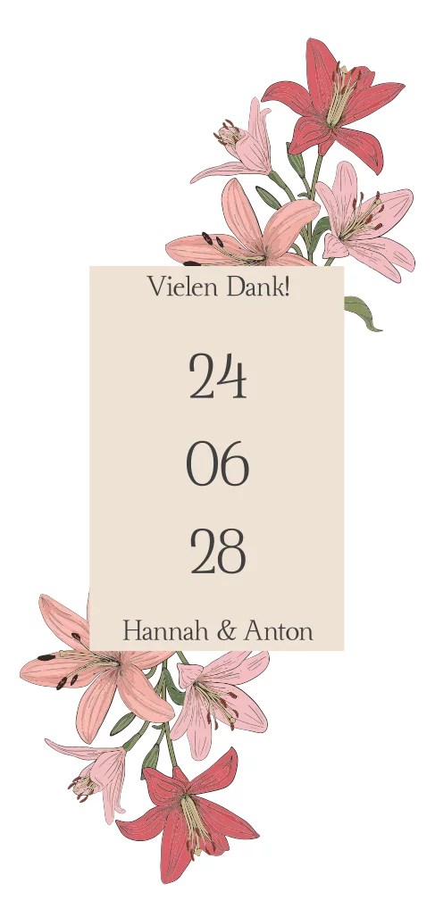 Florale Danksagungskarte zur Hochzeit mit Lilien in rosa und rot