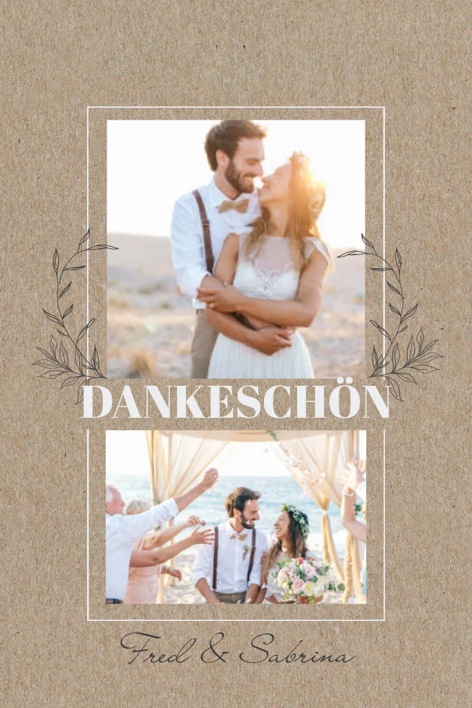 Danksagungskarte zur Hochzeit im Kraftpapierlook mit Fotos. Die schlichte Karte im Hochformat ist mit zarten Zweigen veredelt. Wir empfehlen dieses Design auf Naturkarton drucken zu lassen.