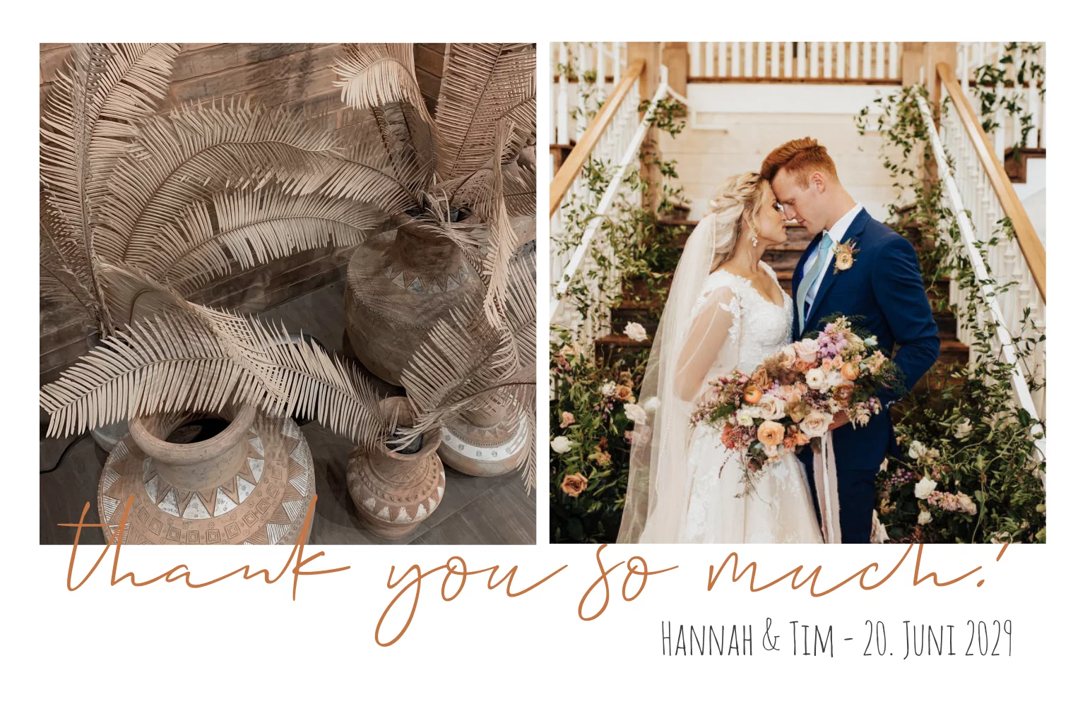 Weiße Dankeskarte zur Hochzeit im Boho-Look mit kupferfarbener Schrift. Die Fotokarte im Postkartenformat hat ein Foto mit Palmenblättern im beliebten Boho Stil und zudem Platz für Euer erstes Hochzeitsfoto. Ihr könnt auch beider Plätze mit eigenen Bildern belegen.