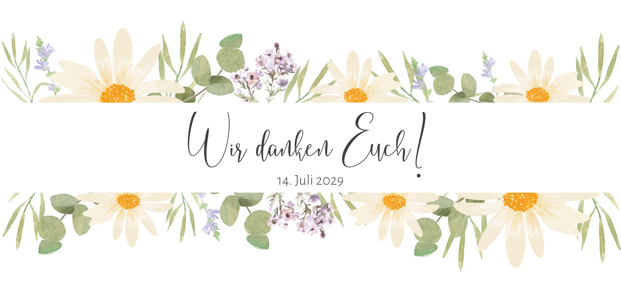 Dankeskarte zur Hochzeit mit bunten Blumen, Eukalyptus und Rahmen