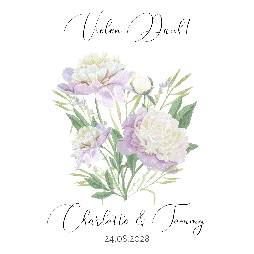 Quadratische Dankeskarte zur Hochzeit mit wunderschönen lila Chrysanthemen. Die weiße Karte kann von Euch nach Euren Wünschen angepasst werden.