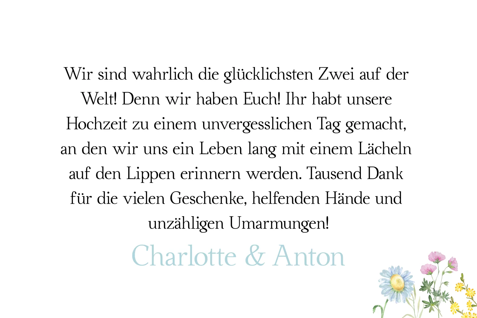 Florale Danksagungskarte zur Hochzeit mit bunten verspielten Blumen und Foto auf der Vorderseite. Die weiße Klappkarte im Postkartenformat hat im Innenteil weitere Blumen.