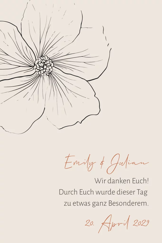 Dankeskarte zur Hochzeit in beige mit Hibiskusblüte und Foto auf der Rückseite. Eine einfache und stilvolle Möglichkeit, sich bei allen zu bedanken, die Euch bei Eurer Hochzeit geholfen haben. Die Hibiskusblüte ist ein Symbol für Freundschaft und Liebe und daher eine perfekte Möglichkeit zu zeigen, wie sehr Ihr schätzt, was die andere Person für Euch getan hat. Das beige Papier verleiht der Karte einen ruhigen und klassischen Look.