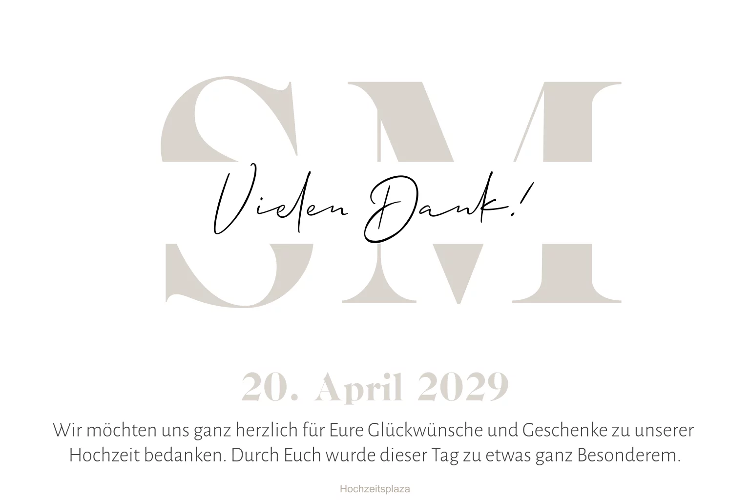 Schlichte Dankeskarte zur Hochzeit mit Initialen in beige und Foto auf der Rückseite der Postkarte.