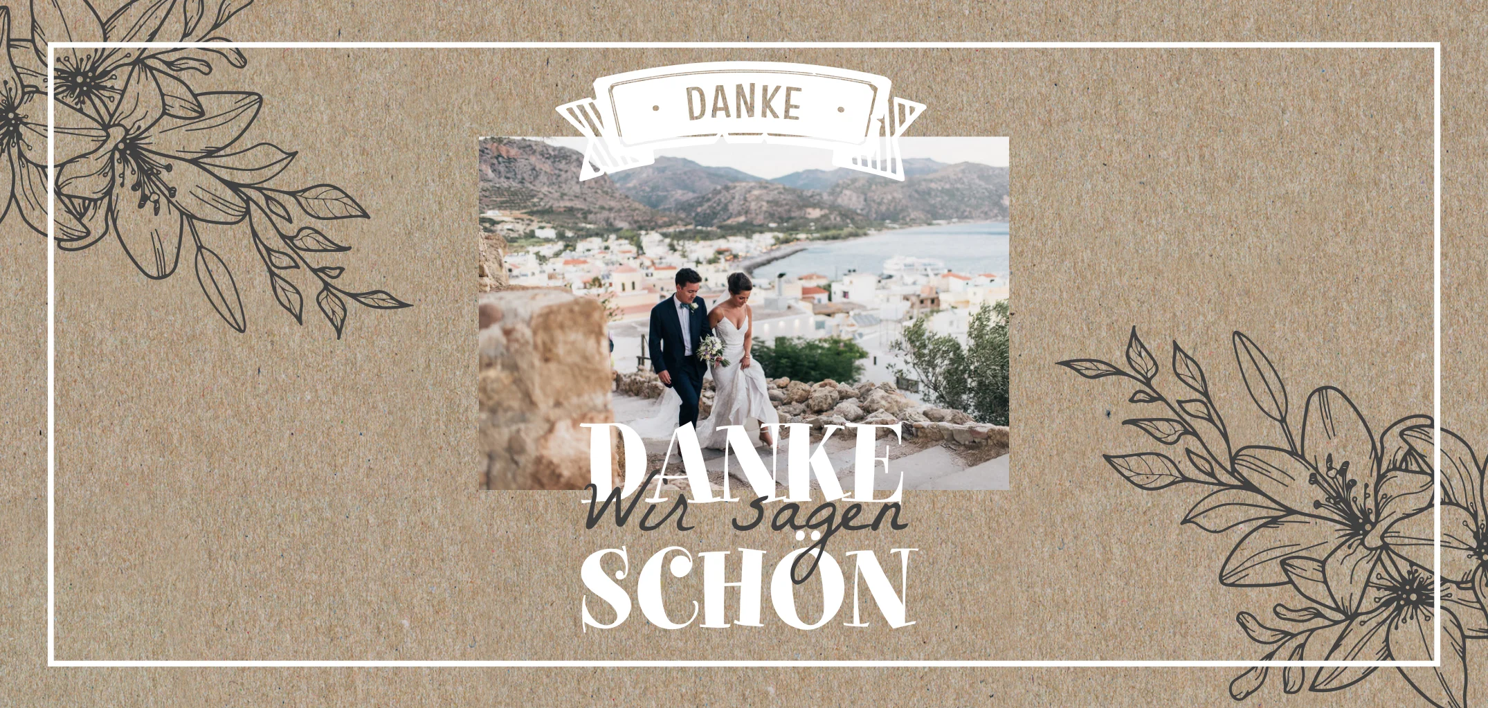 Hochzeitsdankeskarte mit Banner und Line Art Blumen im Kraftpapierlook