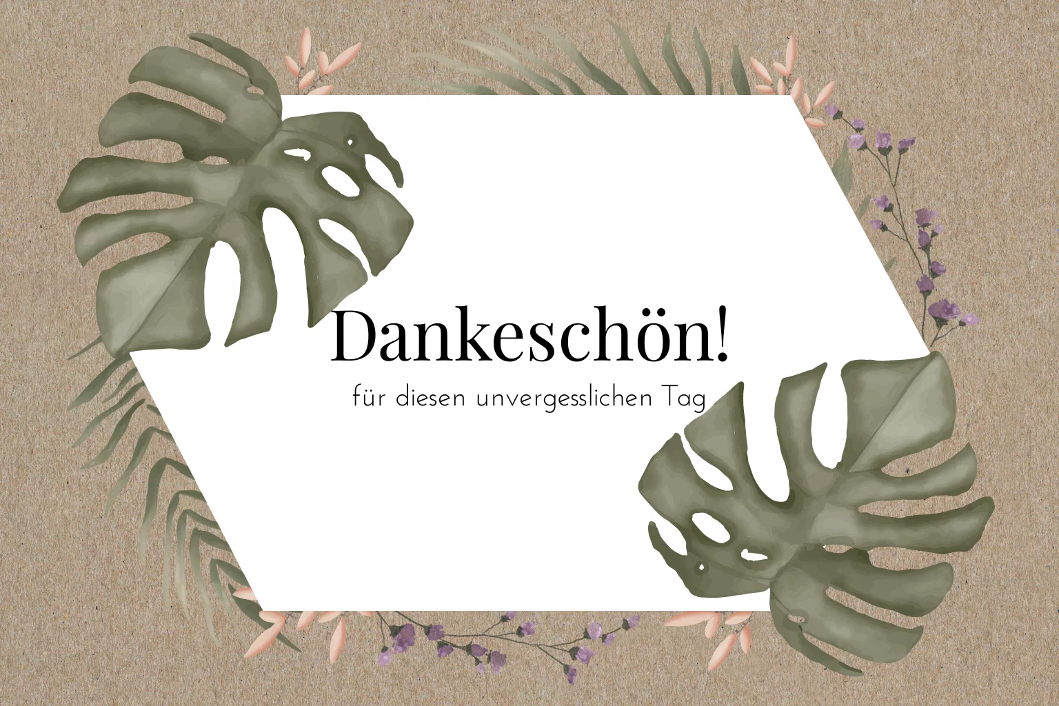 Danksagung zur Hochzeit als Klappkarte auf Kraftpapier mit Monstera Blättern und anderen floralen Elementen.