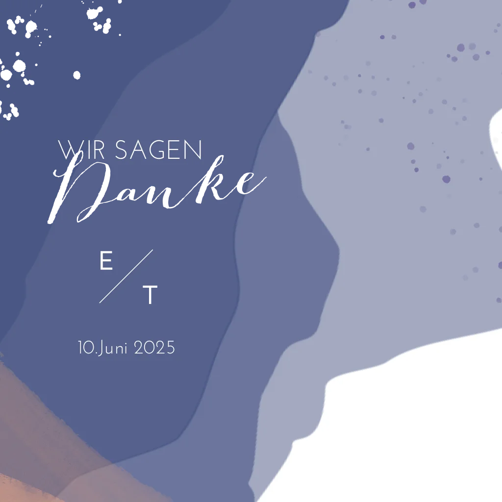 Moderne Danksagung zur Hochzeit in quadratischer Form, unterschiedlichen Blautönen und zarten Roségoldelementen, die foliert werden können.