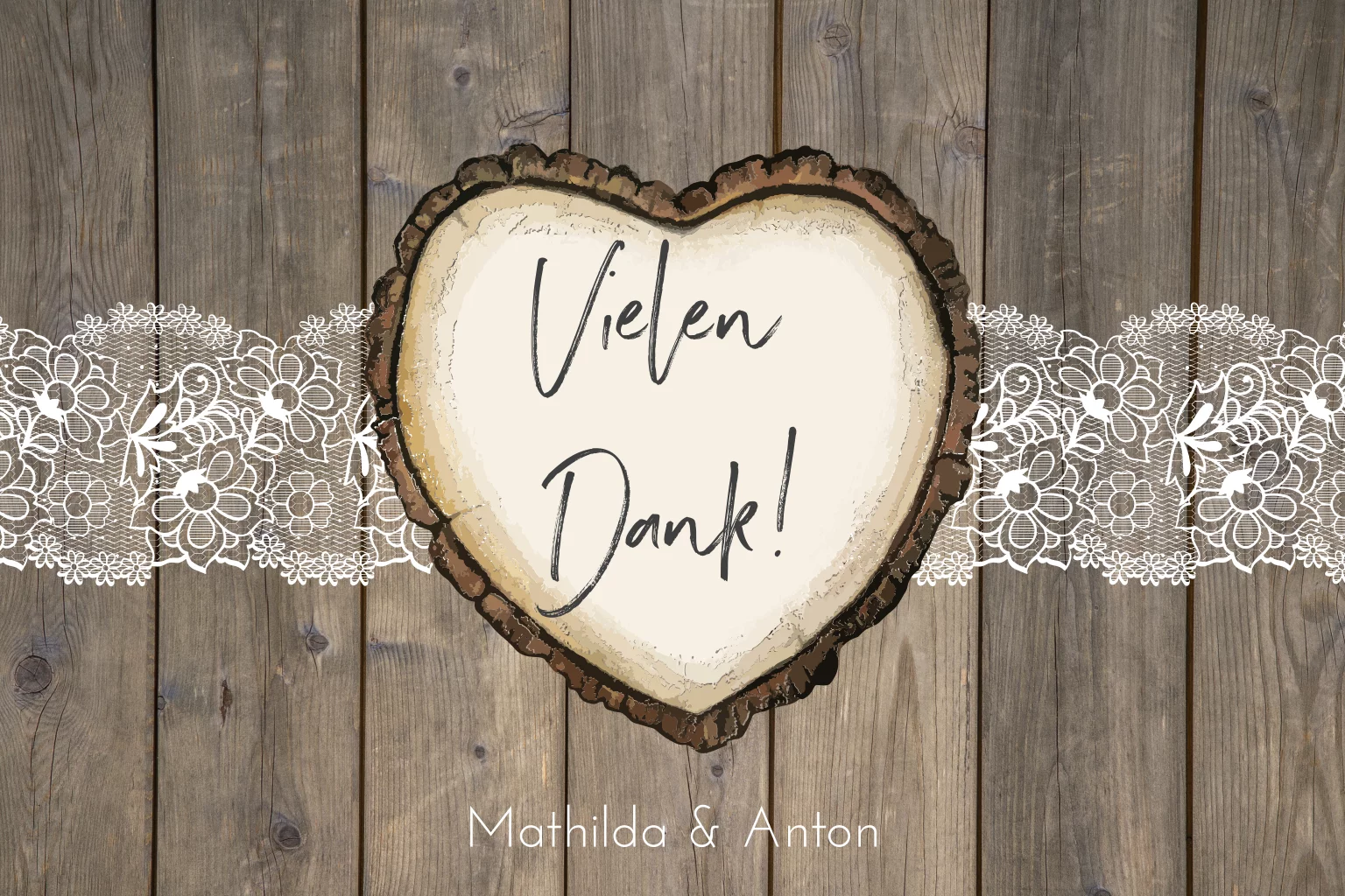 Rustikale Dankeskarte zur Hochzeit in Holzoptik mit Spitze und Herz