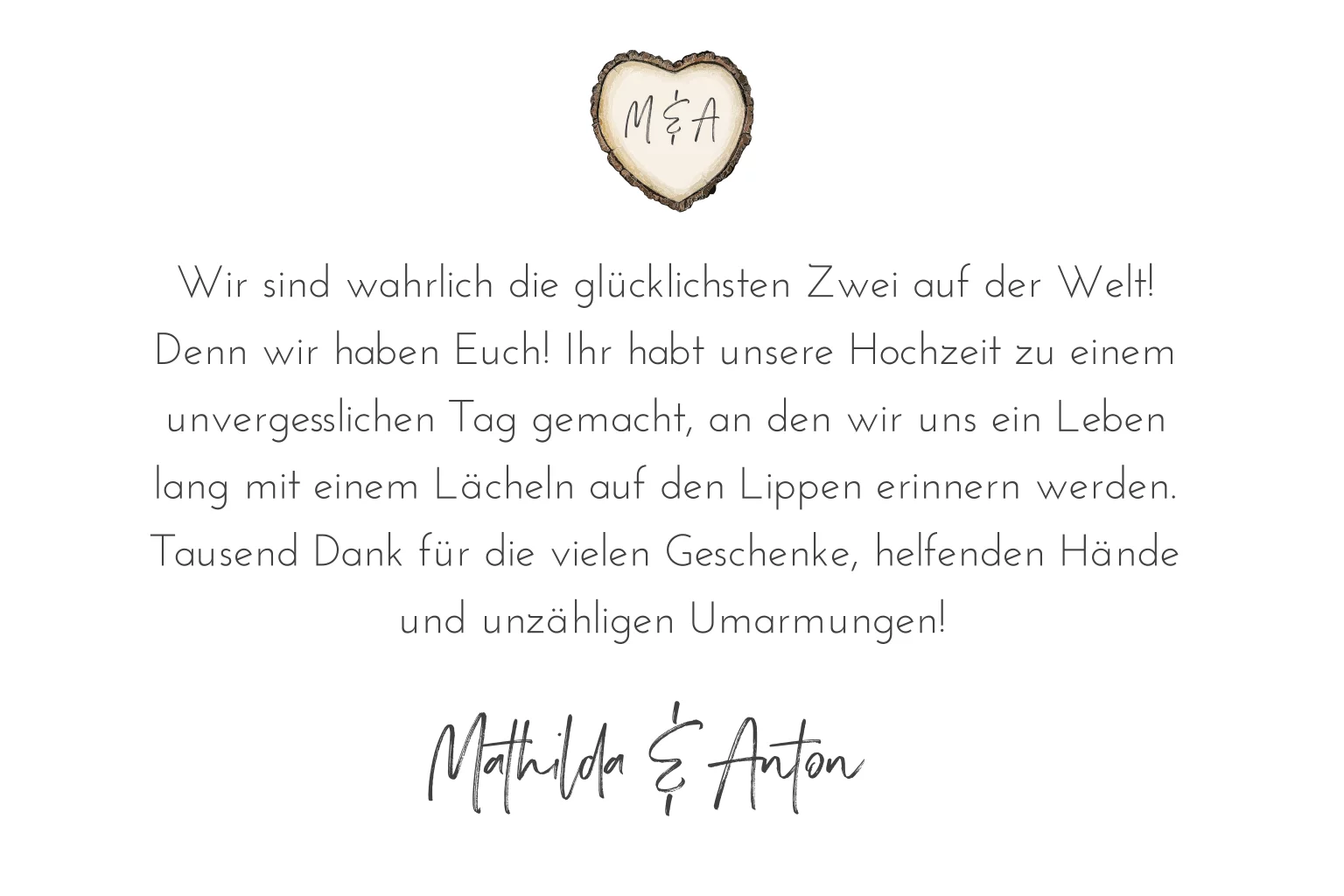 Rustikale Danksagungskarte zur Hochzeit mit weißer Spitze und Herz in Holzoptik. Die Klappkarte hat in der Innenseite Platz für ein Foto. Diese klassische, coole und ländliche Dankeskarte ist perfekt wenn ihr im rustikalen oder Vintage-Look geheiratet habt. Das Holzstammherz und die Spitze auf der Vorderseite wirken romantisch und klassisch.