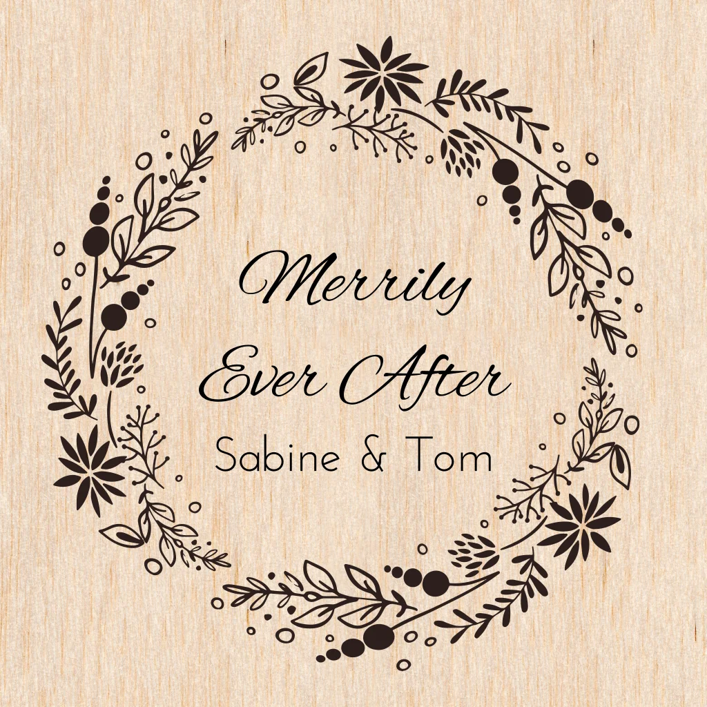 Schlichte Dankeskarte zur Hochzeit aus Holz mit schwarzem Blumenkranz