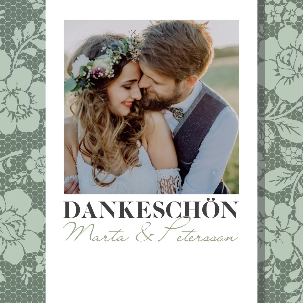 Quadratische Dankeskarte zur Hochzeit als Klappkarte mit Spitze und Rosen in grün. Die Vorderseite der Karte hat einen Sofortbild Rahmen für Euer Hochzeitsfoto.