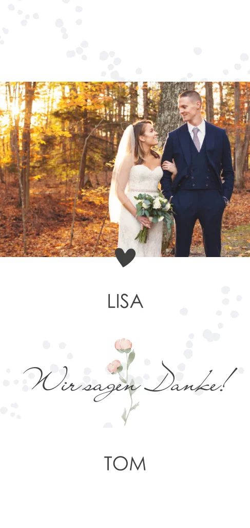 Schlichte, weiße Dankeskarte zur Hochzeit mit Sprenkeln, Foto und Rose