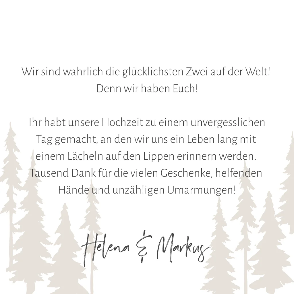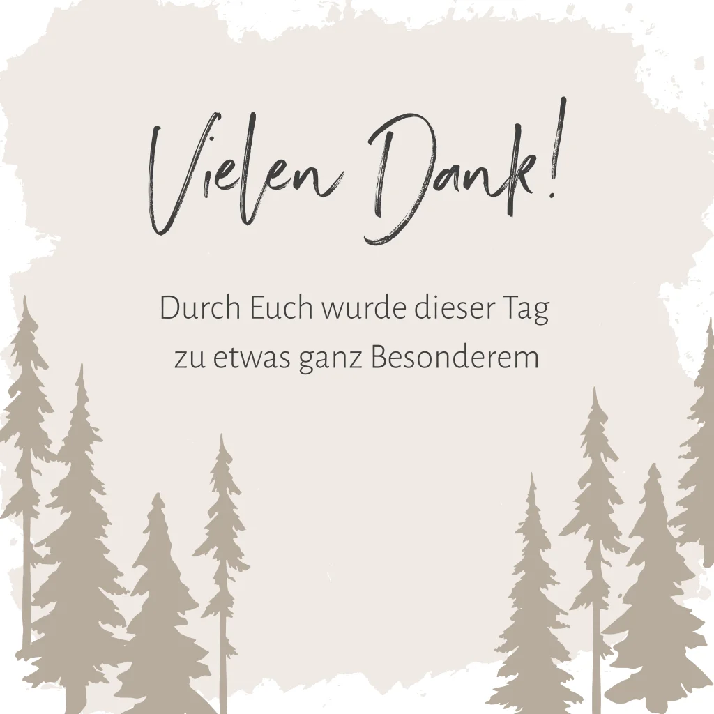 Danksagungskarte zur Hochzeitsfeier mit Tannen in beige. Die weiße Klappkarte hat auf der Vorderseite einen großen Farbklecks in hellem beige. Im Innenteil der weißen Karte ist Platz für ein Foto.